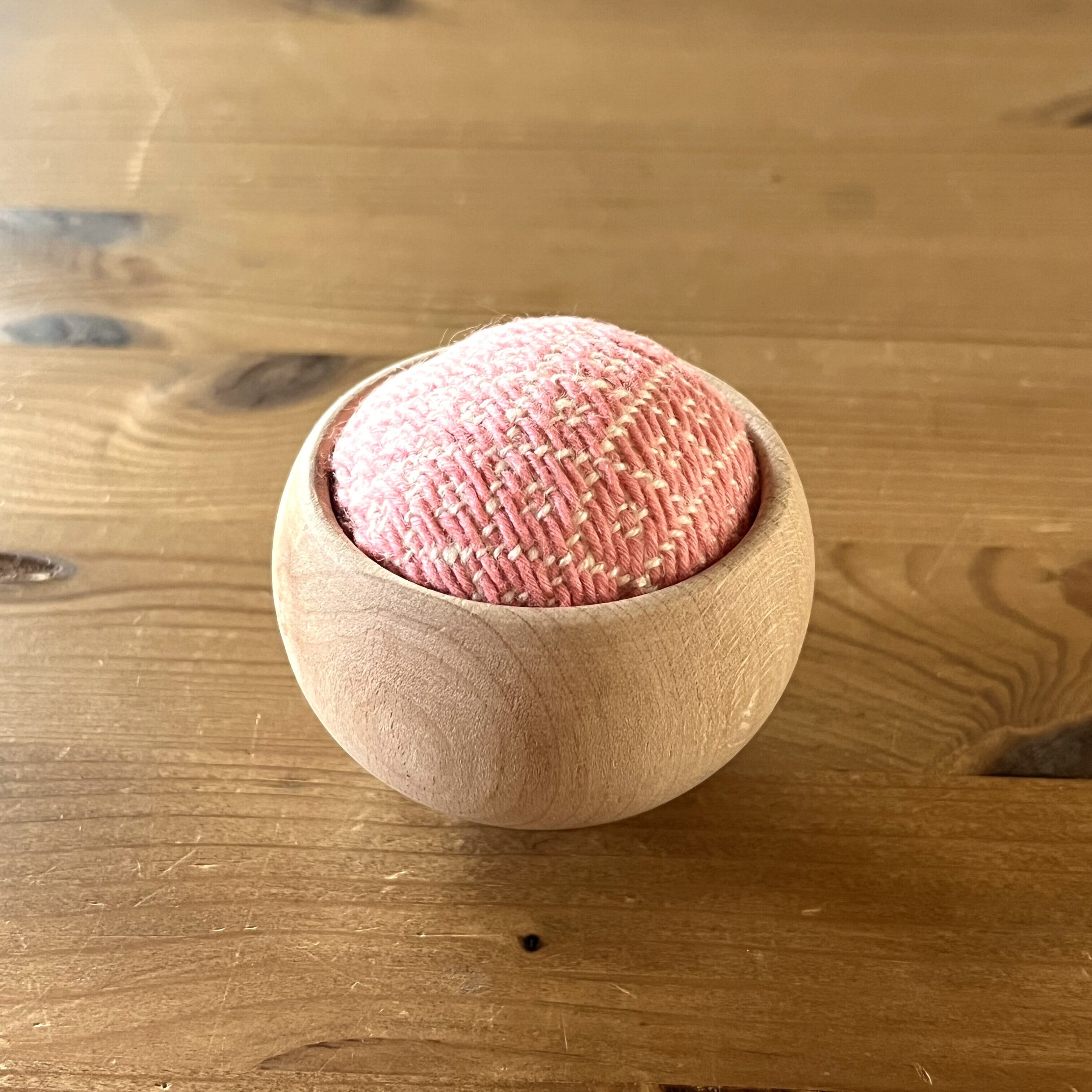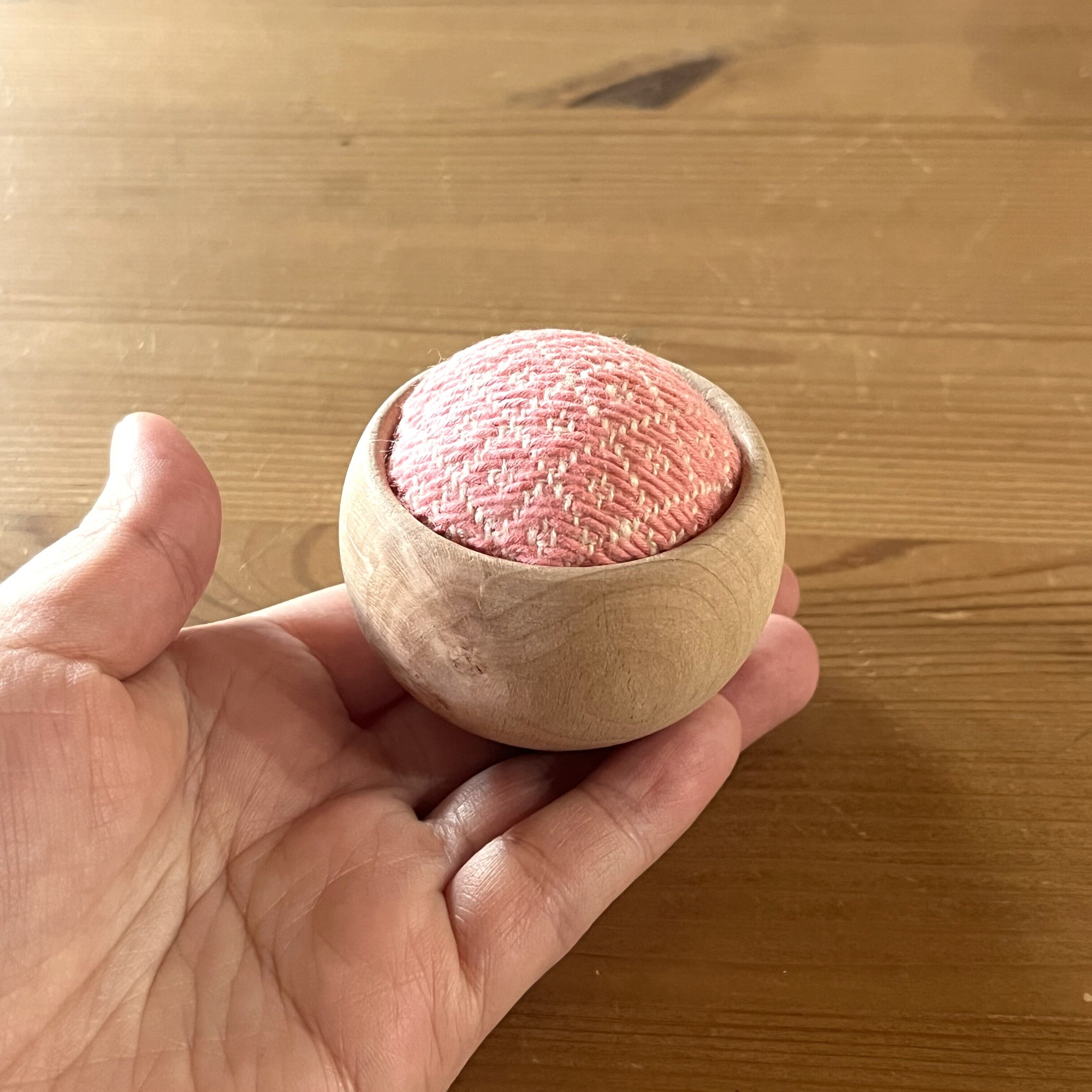 こぎん刺しの「花こ模様」を全面に施した針山です。ころんと丸いウッドボウルが優しく、針仕事が楽しくなるアイテムです。