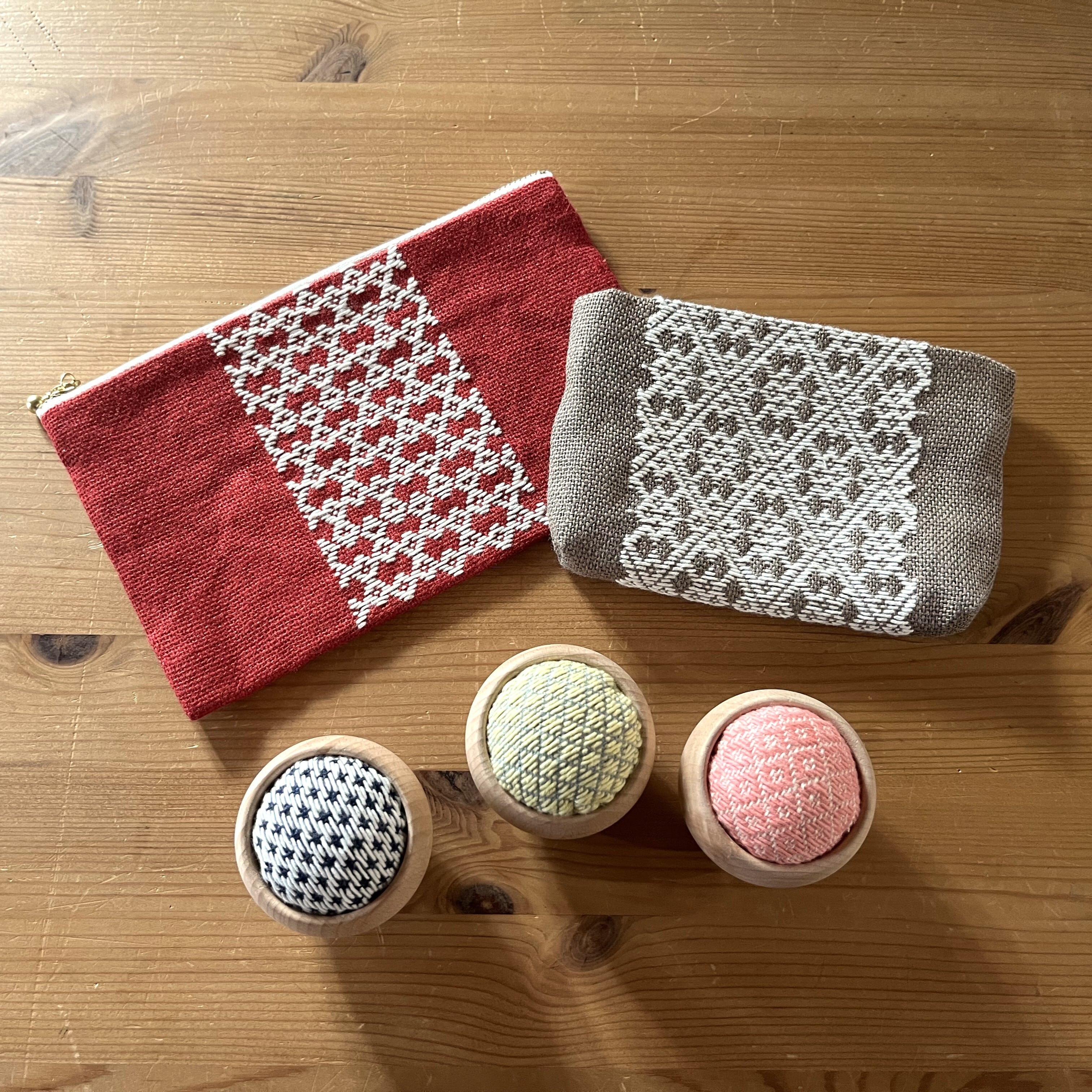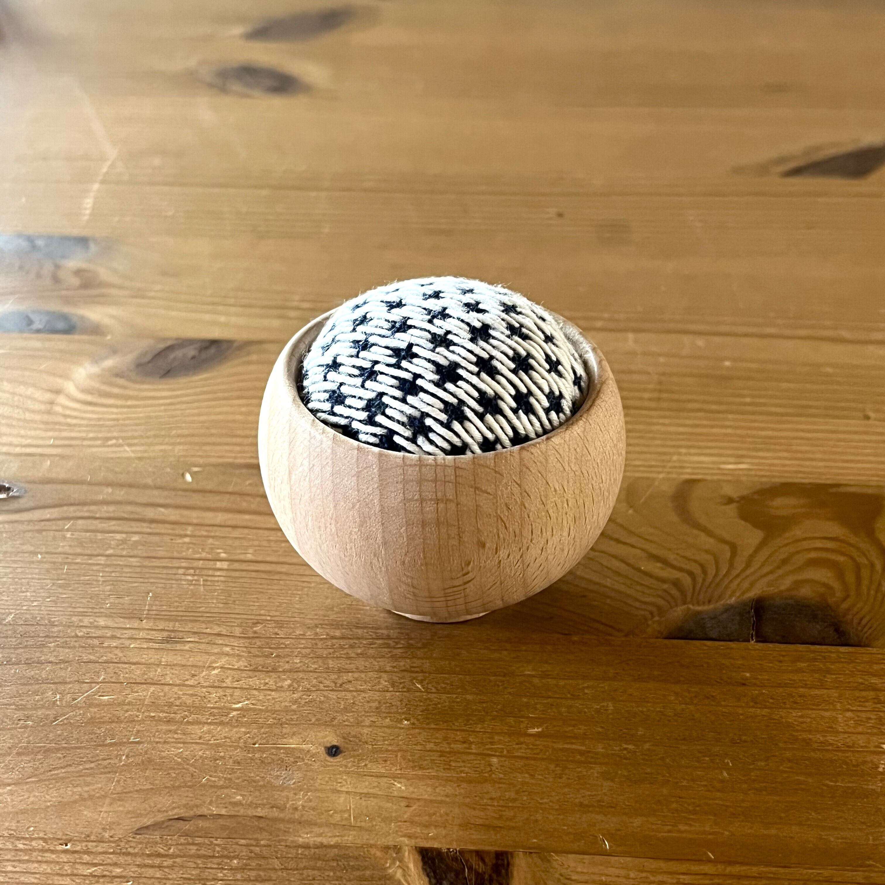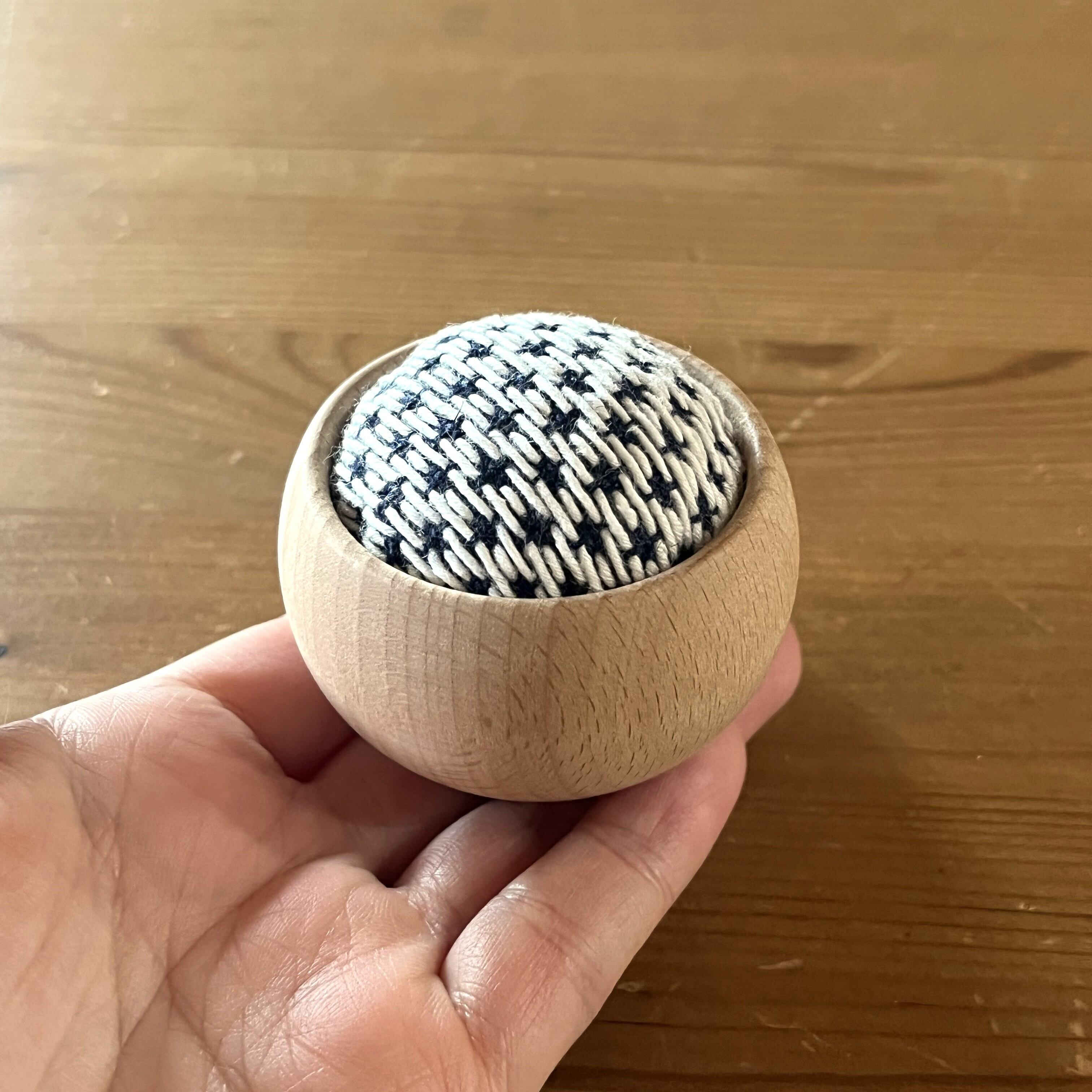 こぎん刺しの「豆こ模様」を全面に施した針山です。ころんと丸いウッドボウルが優しく、針仕事が楽しくなるアイテムです。