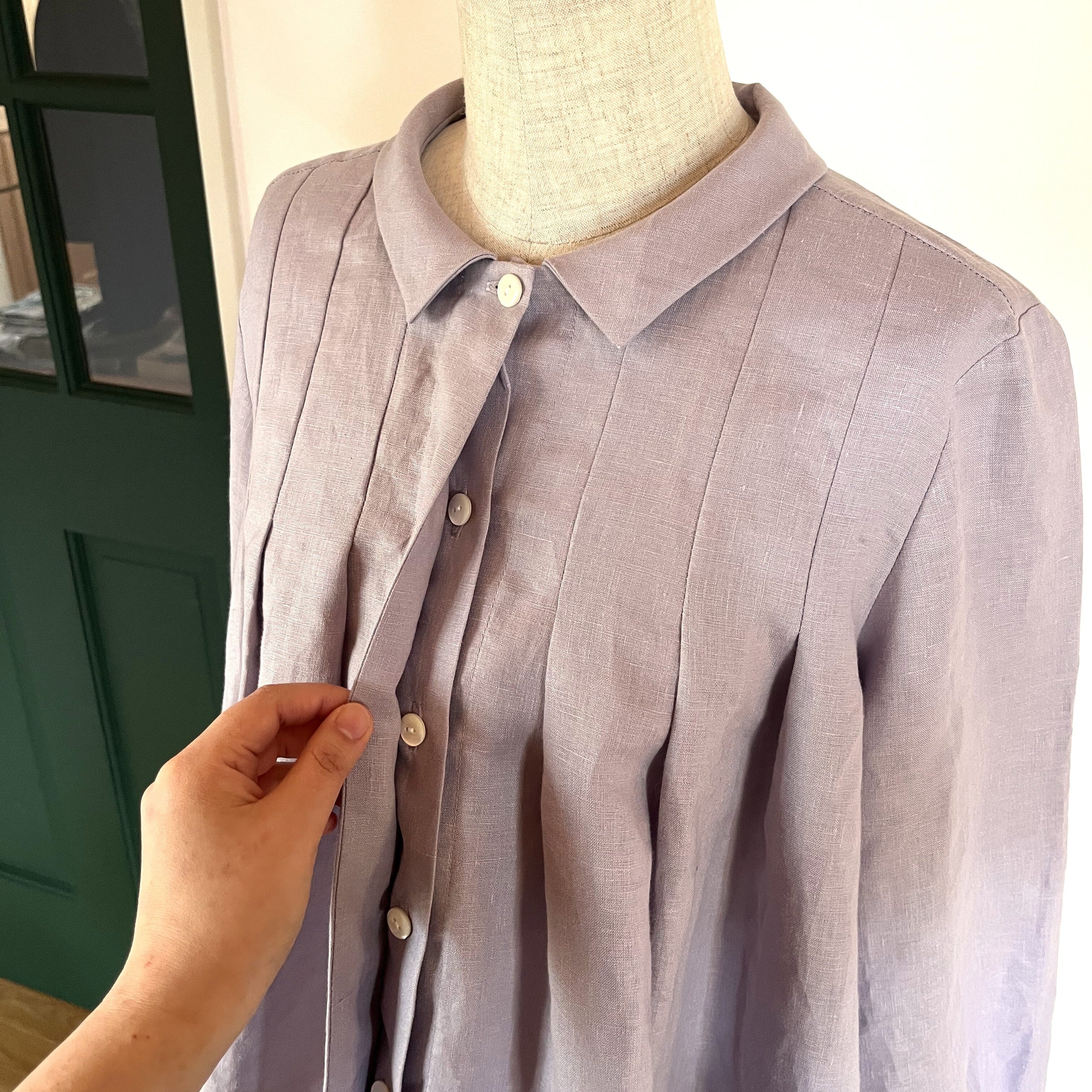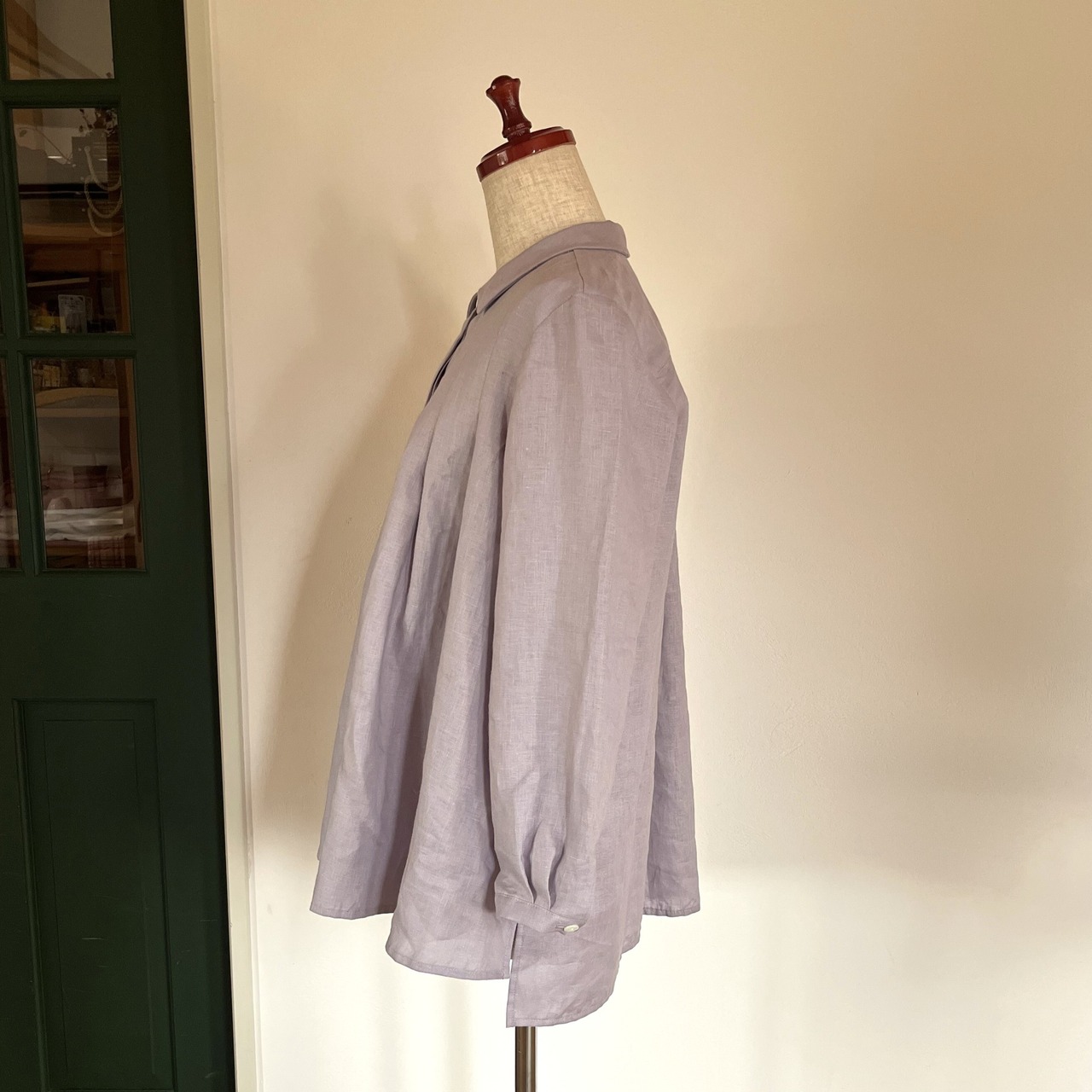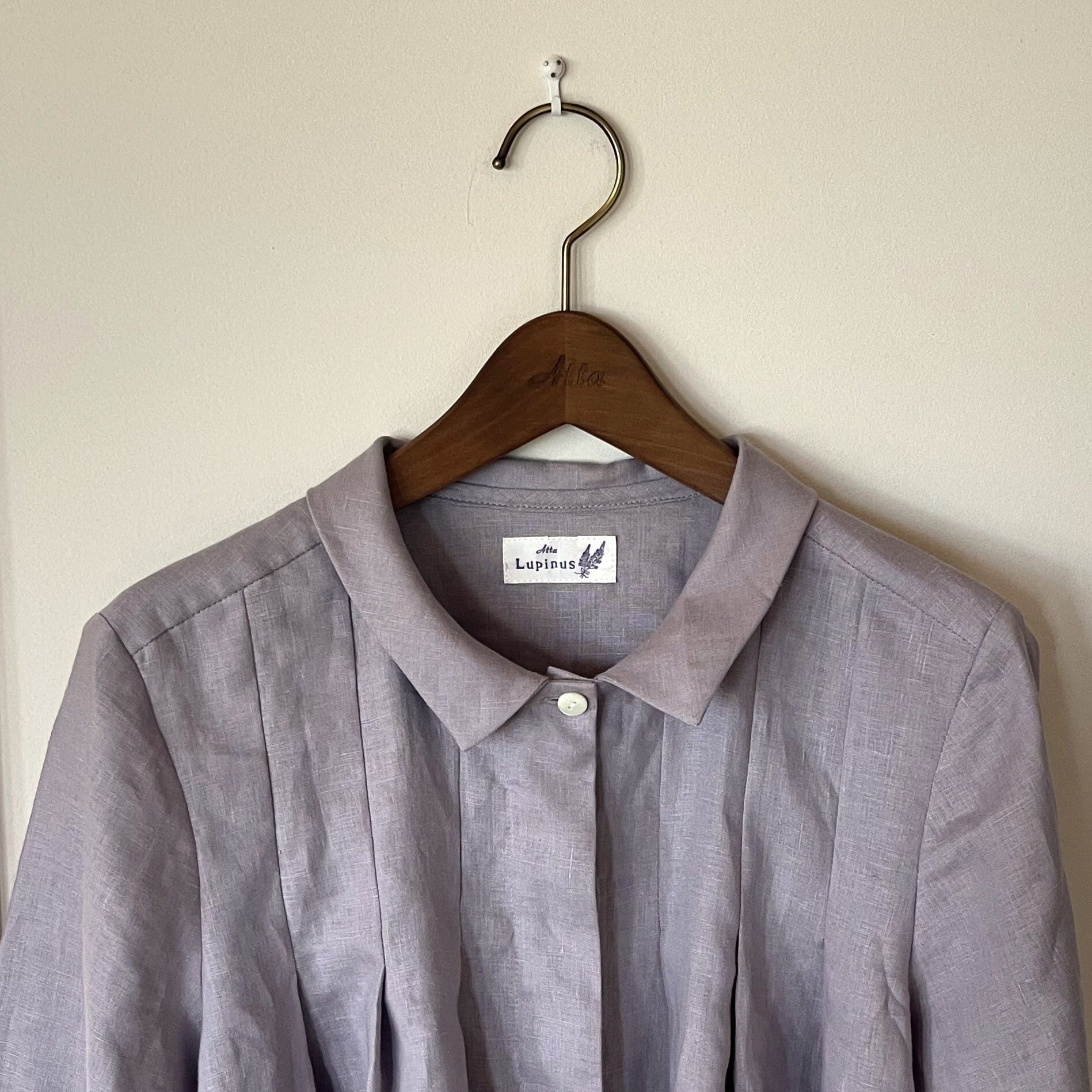 ライラック色のリネン生地を使ってお仕立てしました。