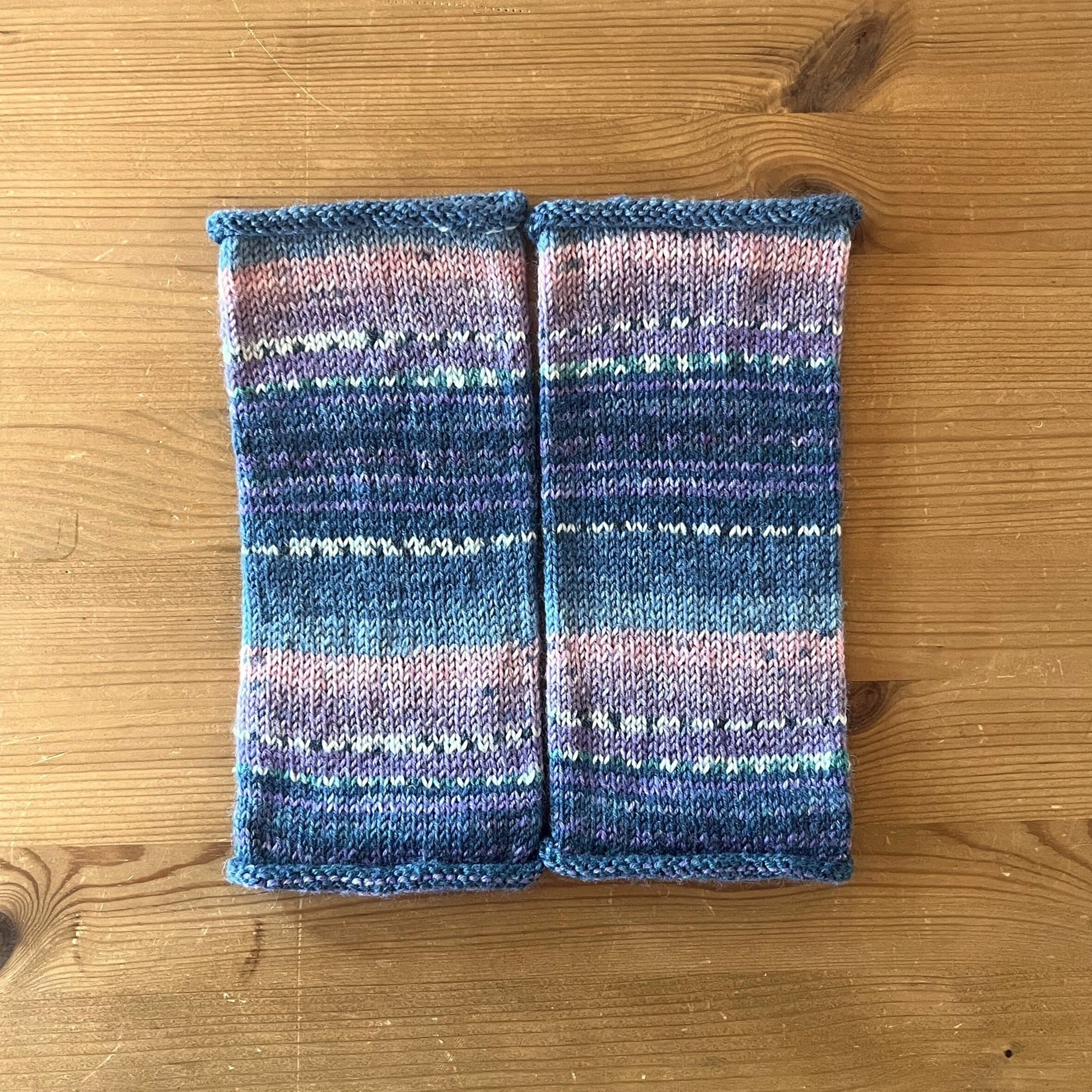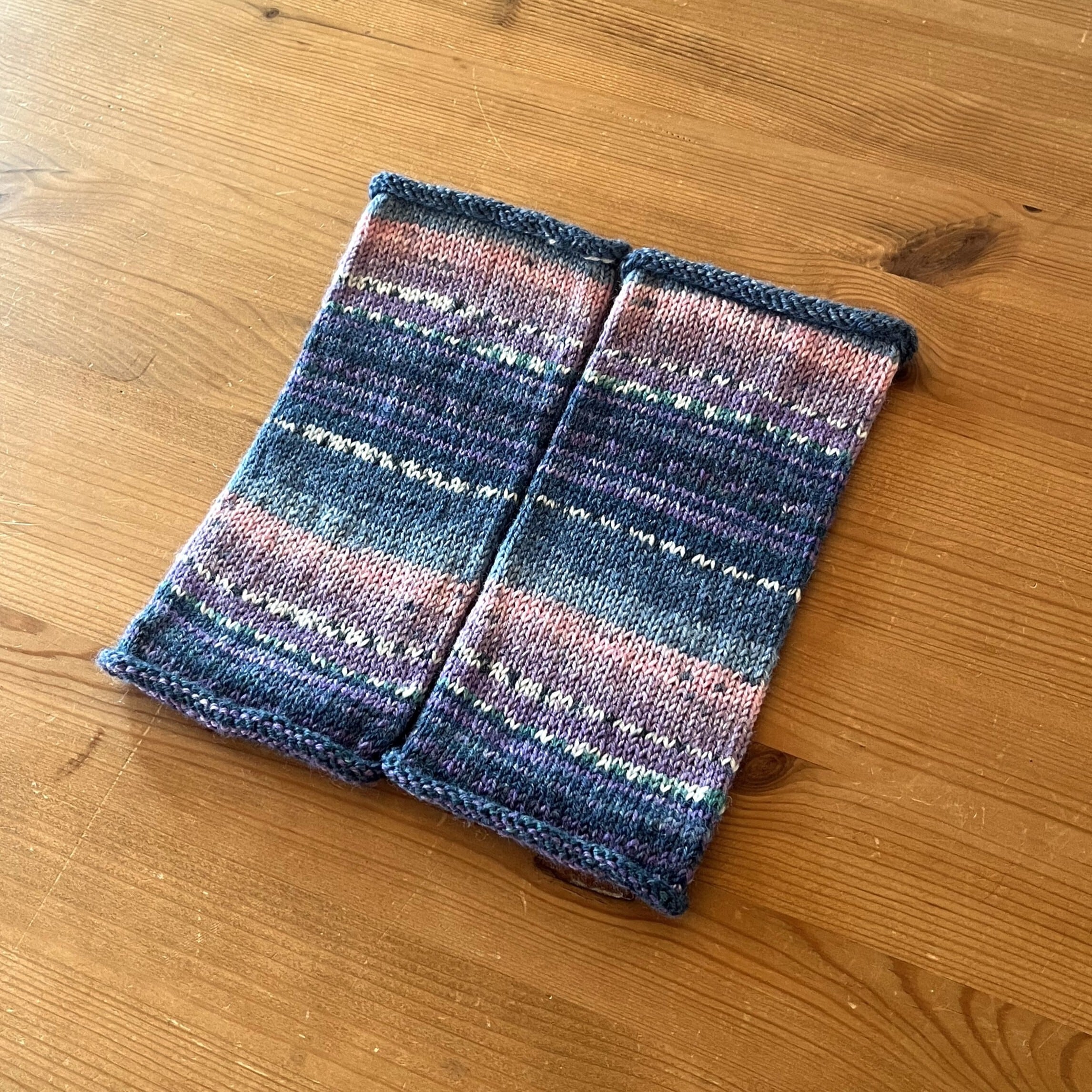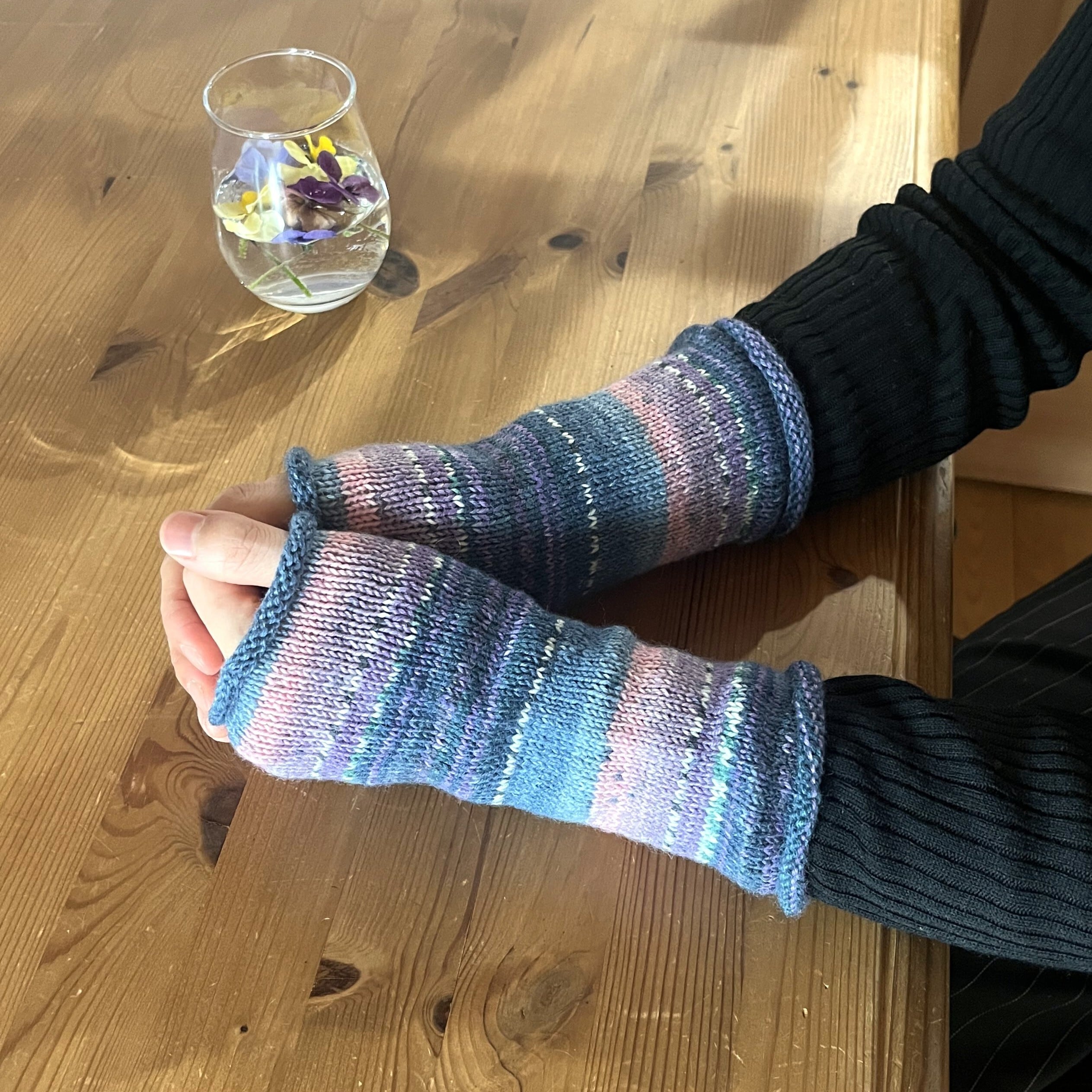 筒状のシンプルな手編みのアームウォーマーです。暖かく柔らかな肌ざわりのオパール毛糸を使っています。