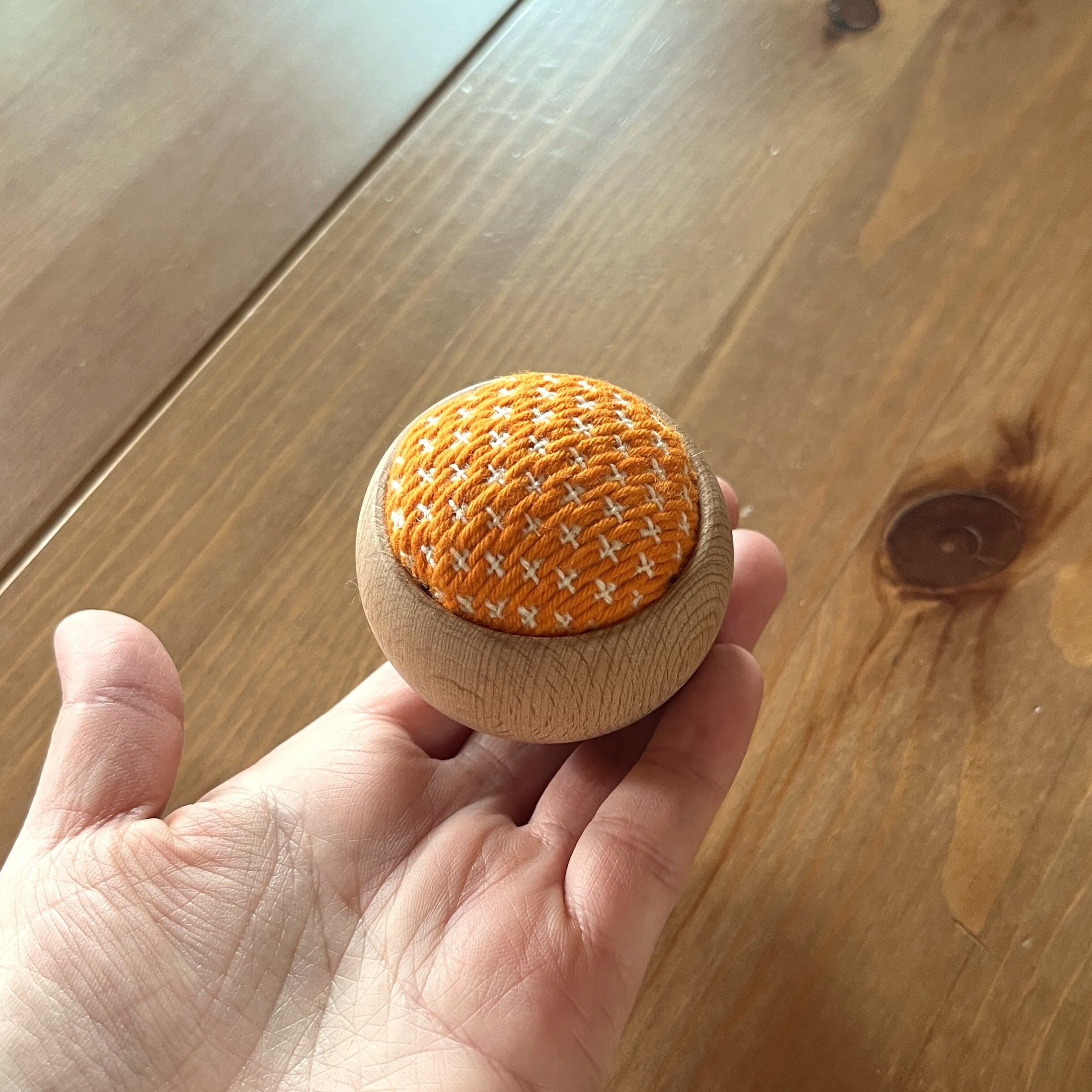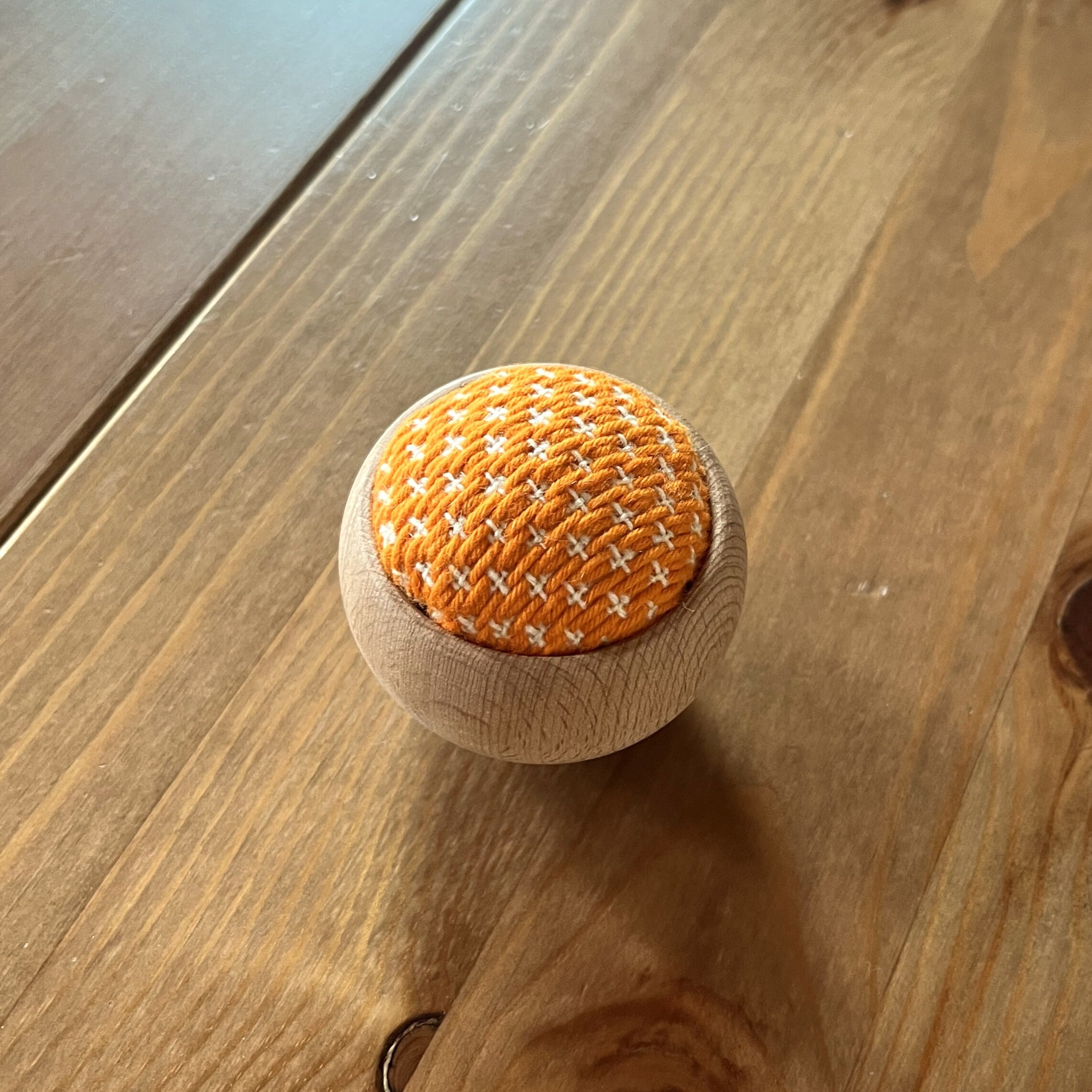 こぎん刺しの「豆こ模様」を全面に施した針山です。ころんと丸いウッドボウルが優しく、針仕事が楽しくなるアイテムです。