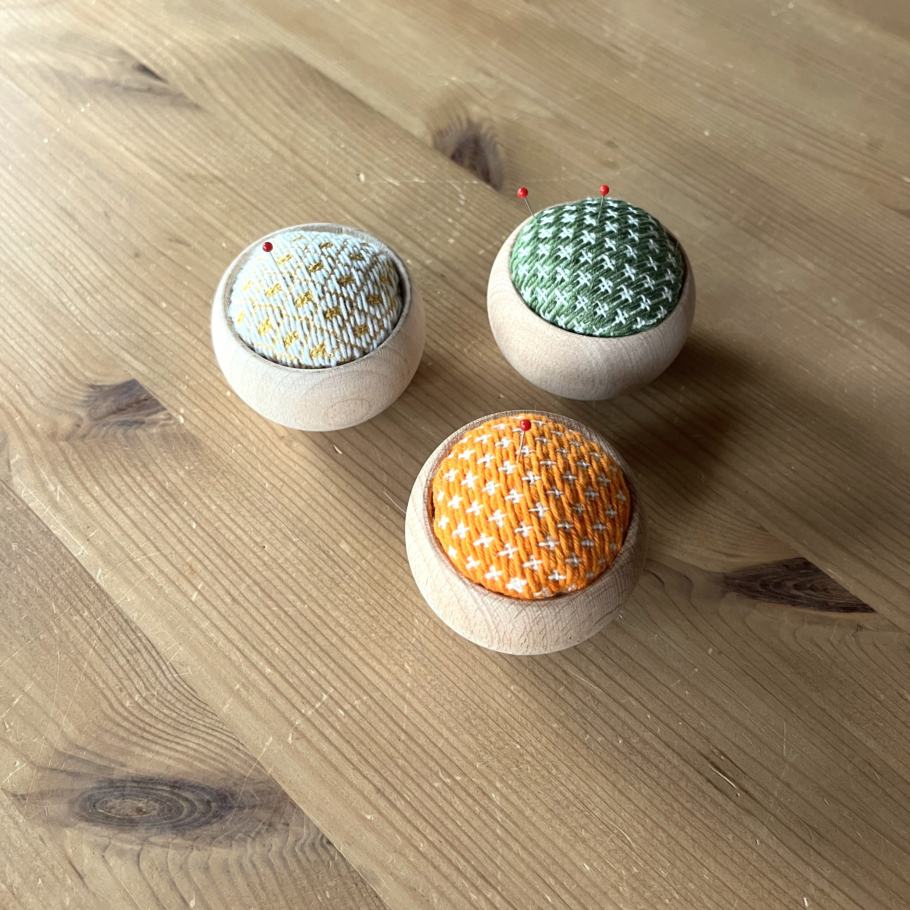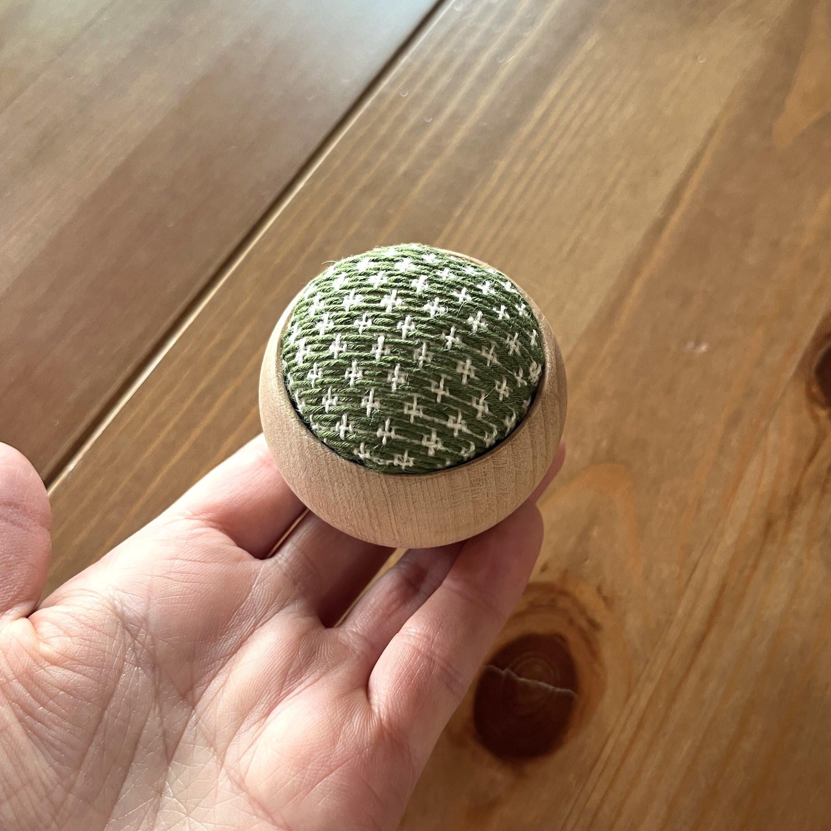 こぎん刺しの「豆こ模様」を全面に施した針山です。ころんと丸いウッドボウルが優しく、針仕事が楽しくなるアイテムです。