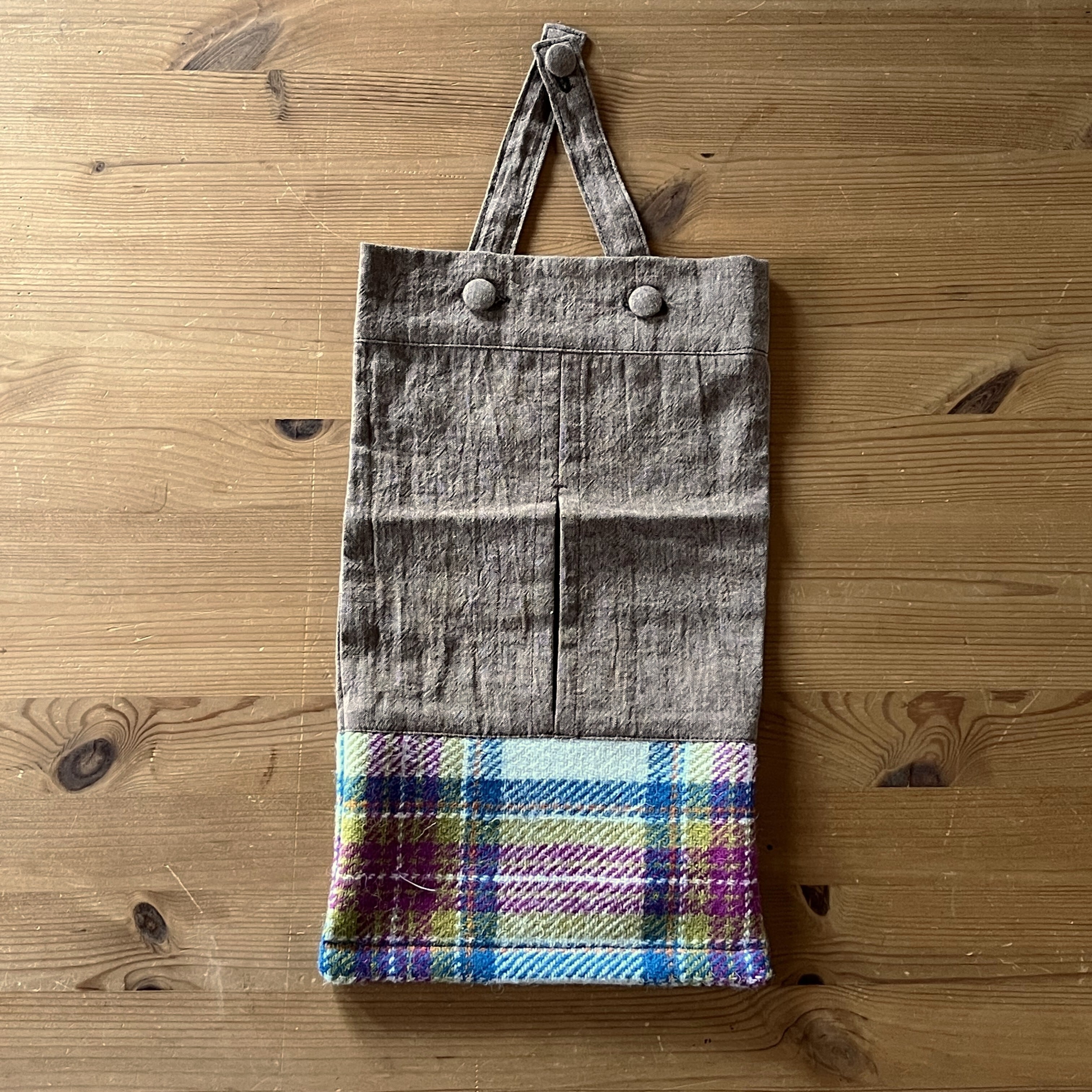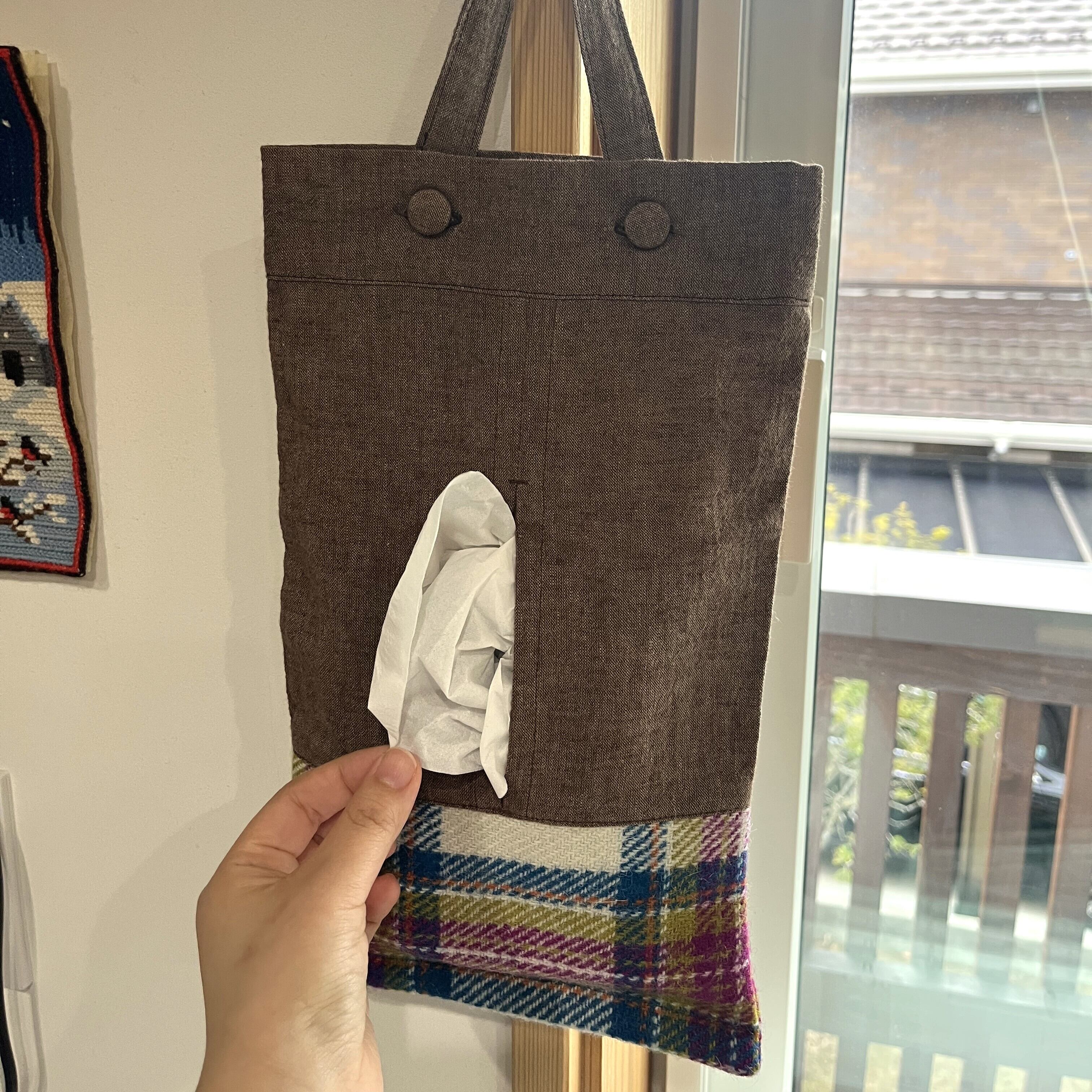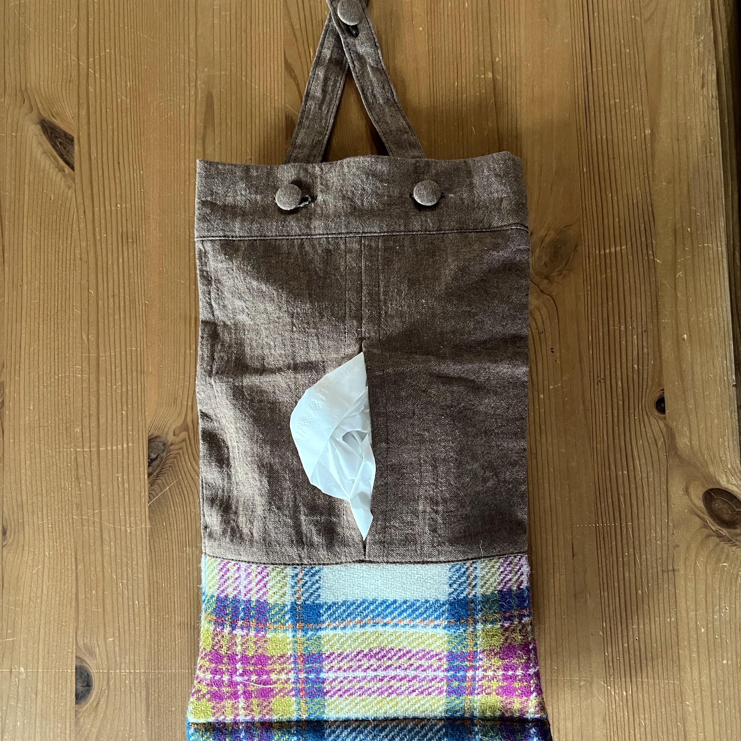 「ハリスツィード」を使ったティッシュケースです。持ち手をボタンで組み合わせたので、卓上に置いても、壁や車に掛けても使えます。ツィードのパープルピンクと茶色の組み合わせで仕上げました。羊毛のほっこり感と色合いの可愛らしさをお楽しみください。