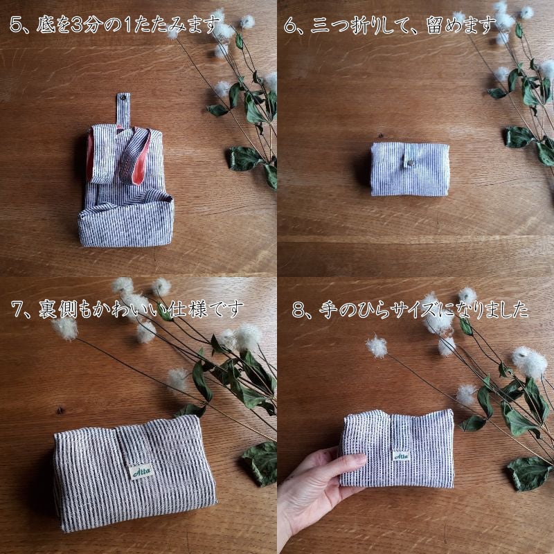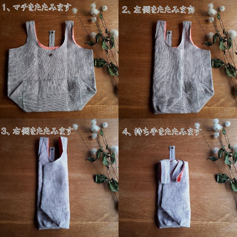 リネンの手触りが気持ちよく、畳むとと小さなサイズになって持ち運んでいる時も可愛いリネンバック。暮らしに馴染むシンプルなデザインと、内布の綺麗な色合いが特徴です。